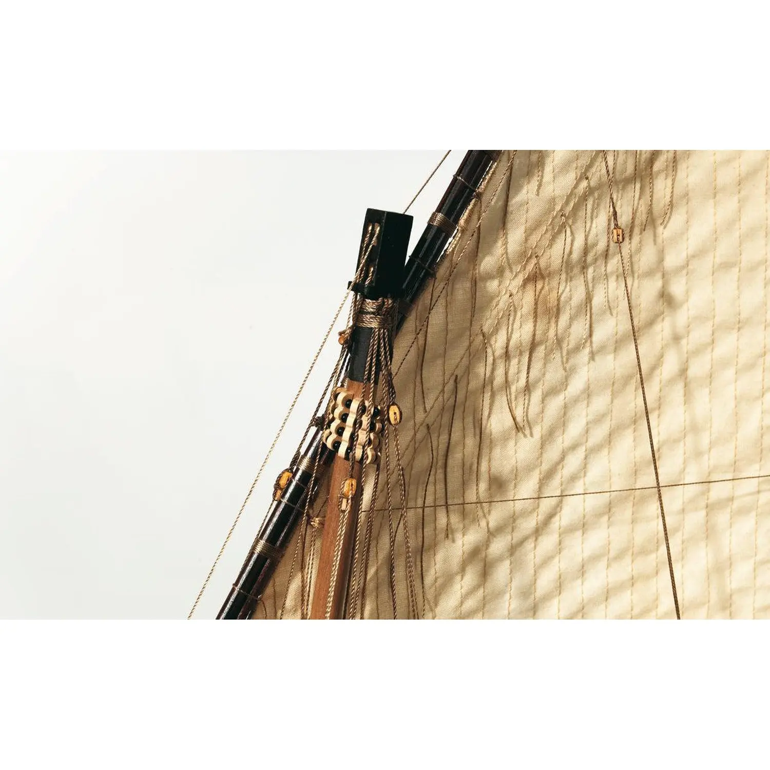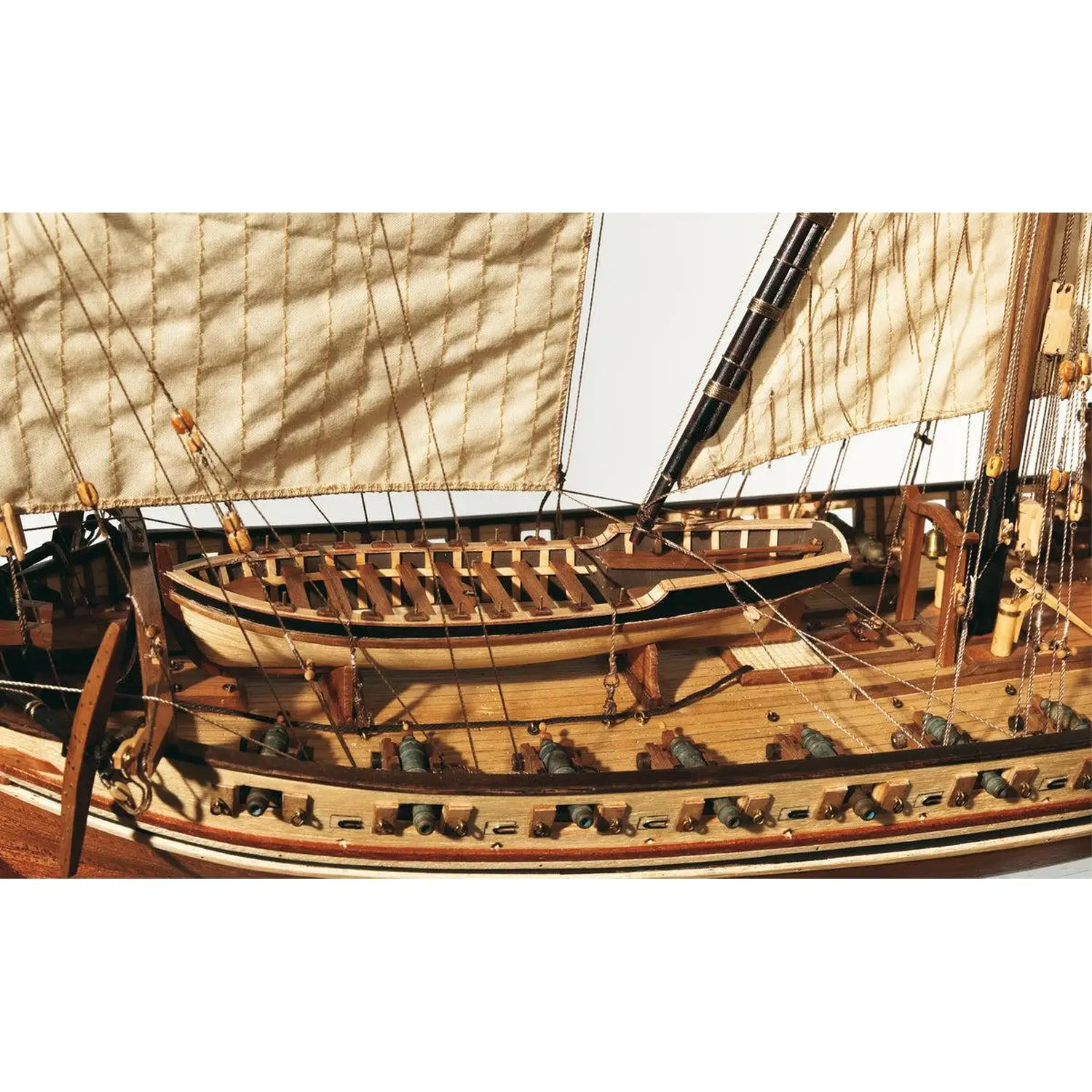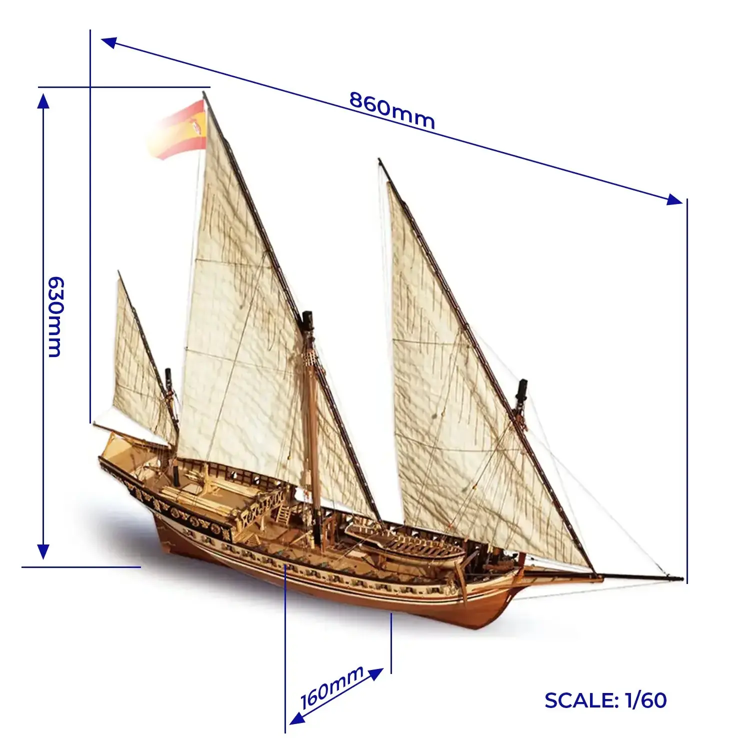 Dřevěný model lodi Jabeque v měřítku 1:60.