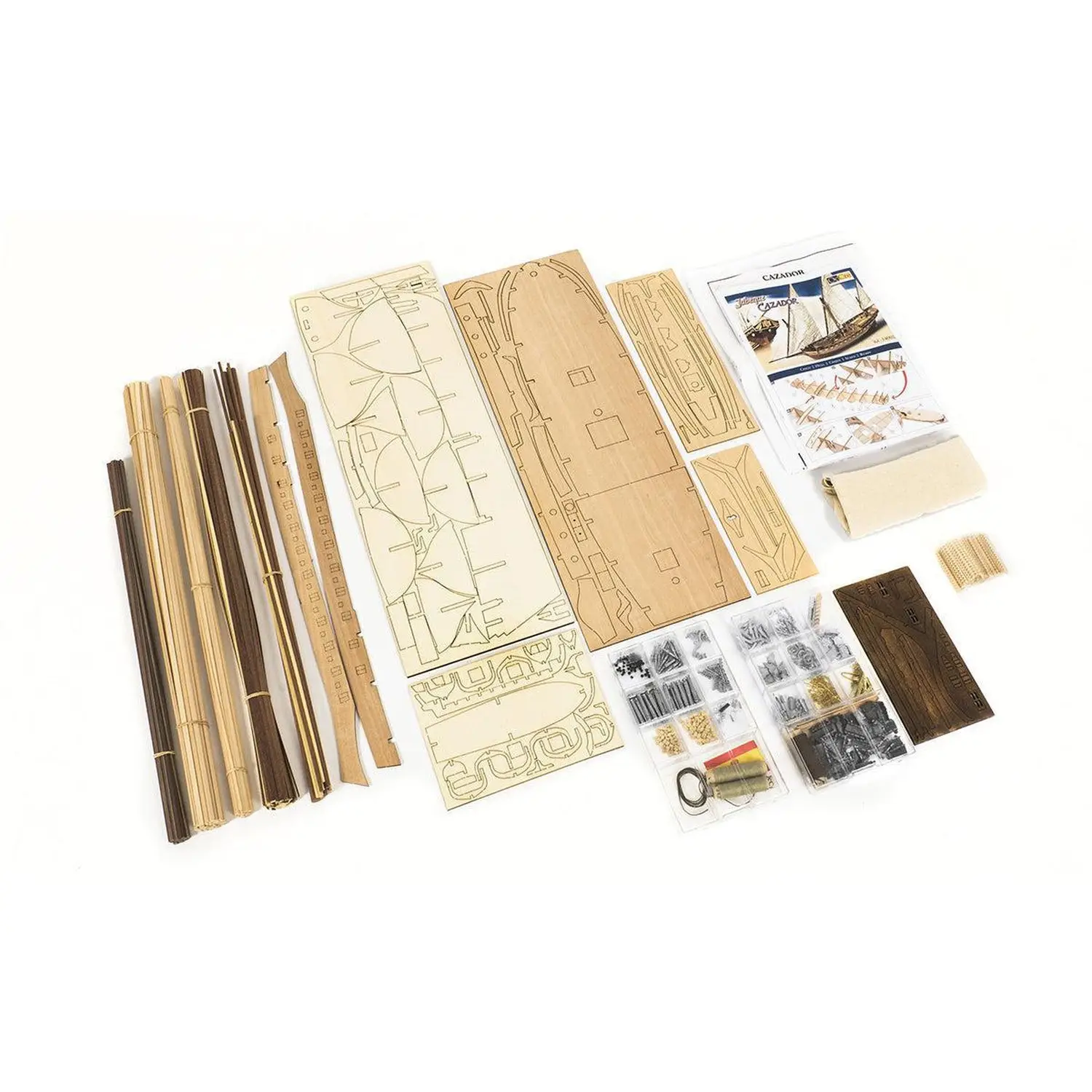 Dřevená stavebnice obsahuje všechno potřebné pro stavbu modelu mimo lepidel, barev a laku, ale to se dá dokoupit zvlášť.