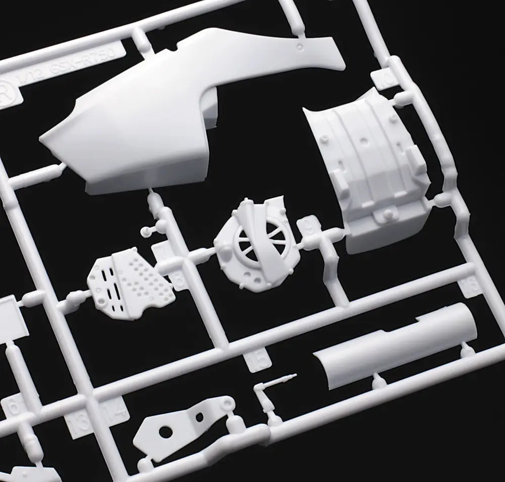 Plastiková stavebnice Suzuki GSX-R750R od Hasegawy Corporation obsahuje: